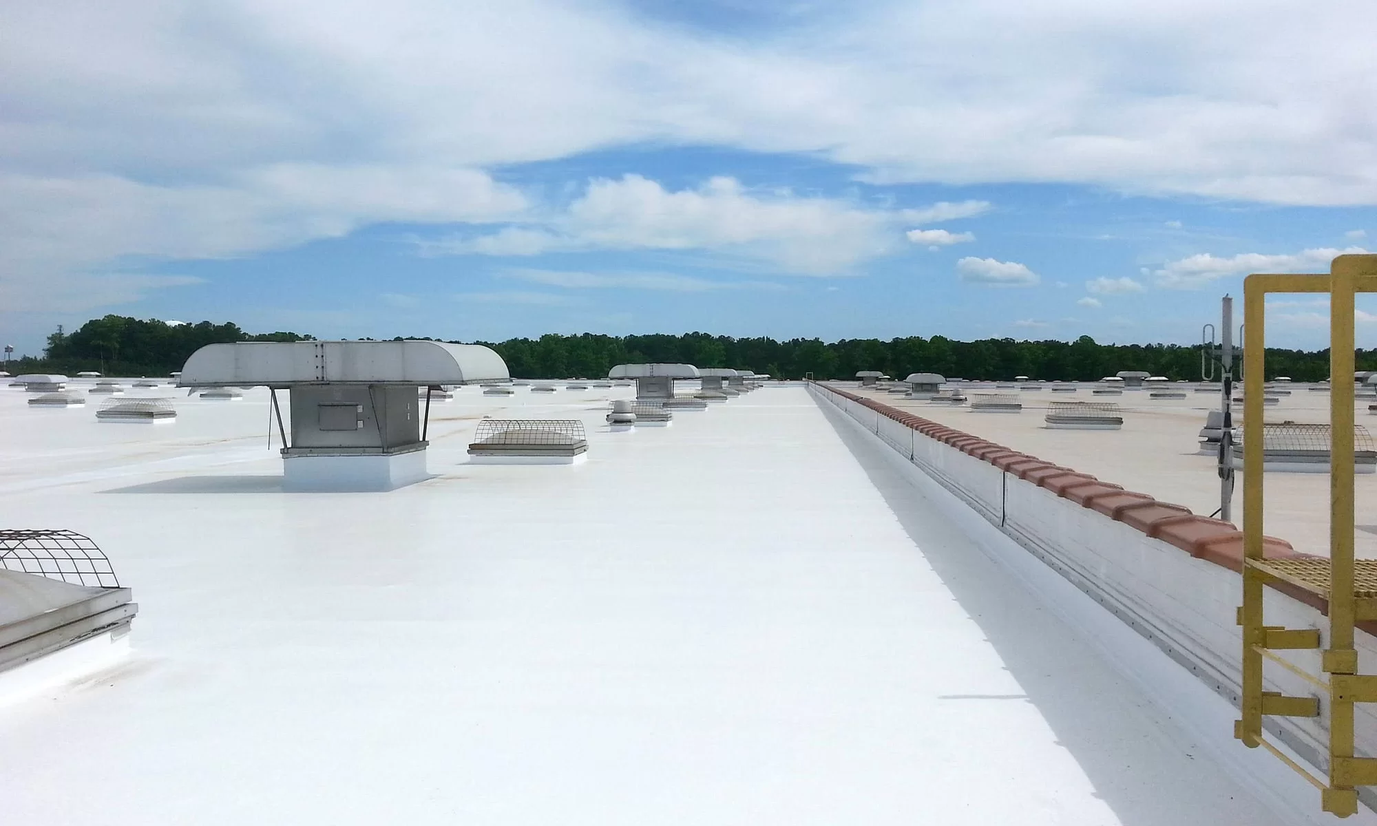 The bright white elastomeric coating reflects the UV lights and significantly reduces the daytime temperature.